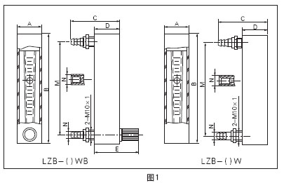 LZB-()WB系列流量計配有流量調節閥,外形及安裝尺寸見圖1和表1。 LZB-()W系列流量計不帶流量調節閥,外形及安裝尺寸見圖1和表1。 |